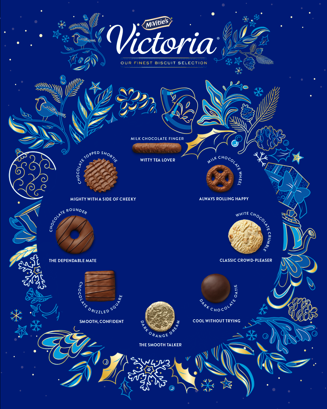 This included a three-frame carousel built around festive biscuit wordplay, static posts that highlighted the personalities of different biscuits within the selection box, and a graphic inspired by the back-of-pack layout, styled in McVitie’s iconic blue.